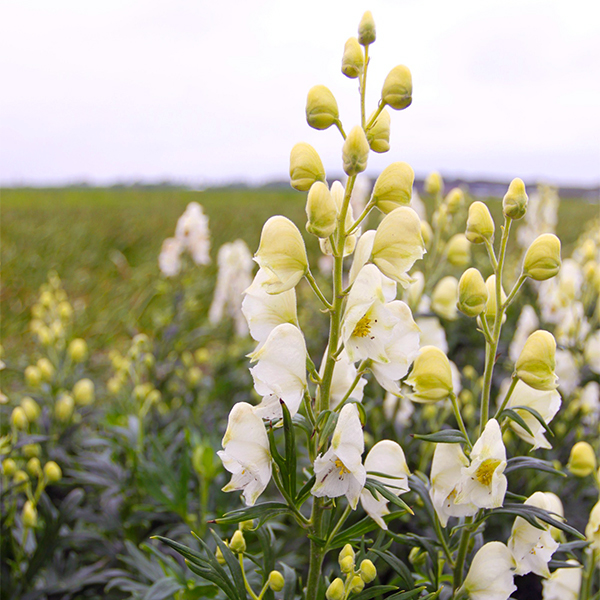 Саженцы Аконита (Борца) клобучкового Альбум (Album) привлекательны внушительными размерами, неприхотливостью и универсальностью. Травянистый многолетник одинаково хорошо растет на солнце и в тенистом цветнике. На прямостоячих прочных стеблях, высотой до метра, распускаются многочисленные белоснежные цветочки удивительной формы: верхние широкие лепестки соединены в подобие капюшона, нижние остаются раскрытыми. Размер каждого бутона не превышает 3 сантиметров. Цветение обильное, с июля по конец сентября.