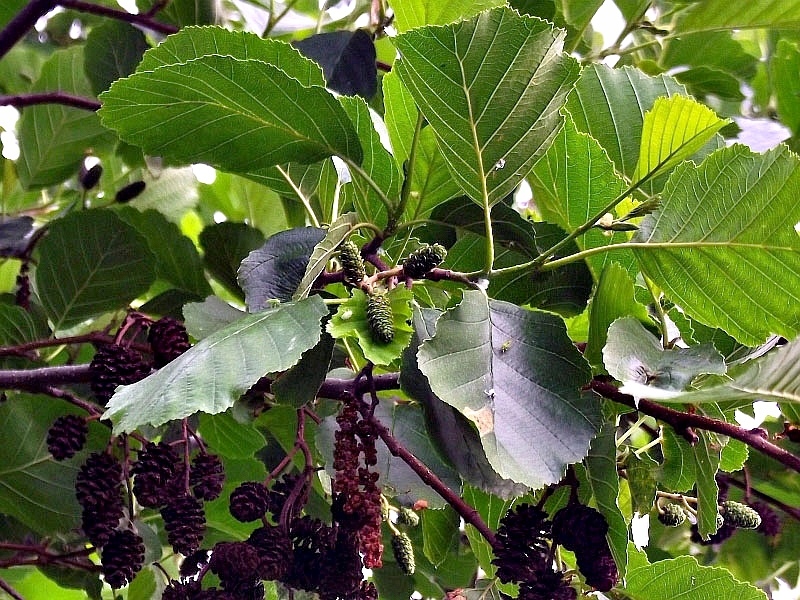 Саженцы Ольхи черной Рубринервия (Rubrinervia) – дерево среднего размера. Высота не превышает пятнадцати метров. Крона в форме пирамиды достигает восьми метров. Ствол и крупные ветки покрыты коричневой корой с бороздами. Листочки насыщенного зелёного цвета украшены красными прожилками, и такого же цвета черешками.