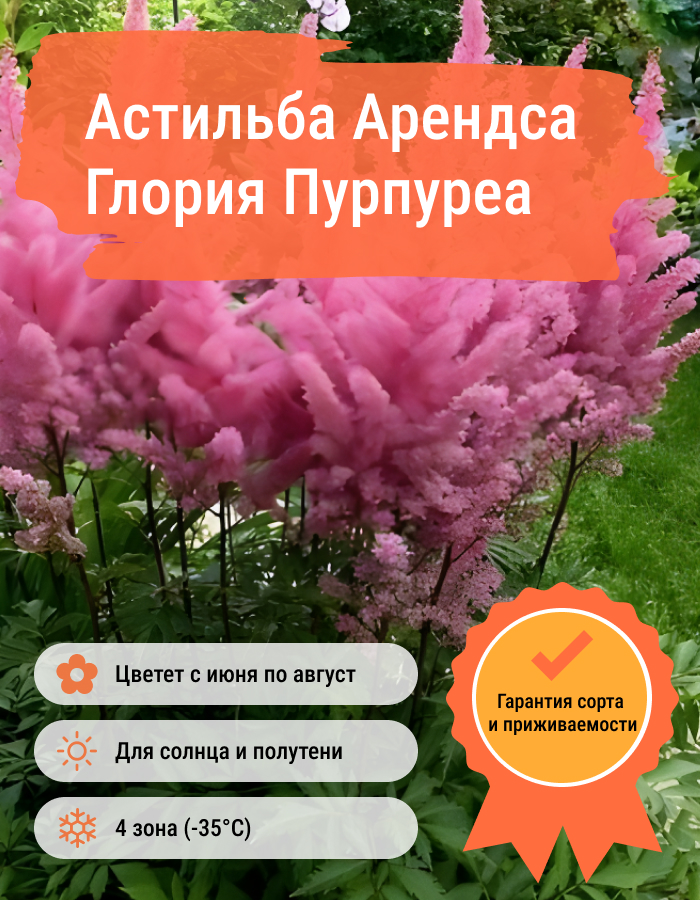 Рассада астильбы Арендса Глория Пурпуреа (Gloria Purpurea) превратится в сиреневые облака, опустившиеся на зеленую листву. Молодые побеги распускаются в темно-красные резные листья, которые со временем зеленеют. Стебли усеяны мелкими соцветиями, издалека сливающиеся в единую пушистую массу. Аромат почти отсутствует. Взрослые растения имеют форму кустов, с пирамидальными формами крон. Максимальная высота 80 см. Период цветения июнь – июль, затем образовываются семенные коробки. Сорт способен хорошо развиваться как на освещенных местах, так и в тени. Высокая морозостойкость позволяет высаживать растение в северных регионах России. Особенности посадки астильбы Глория Пурпуреа: