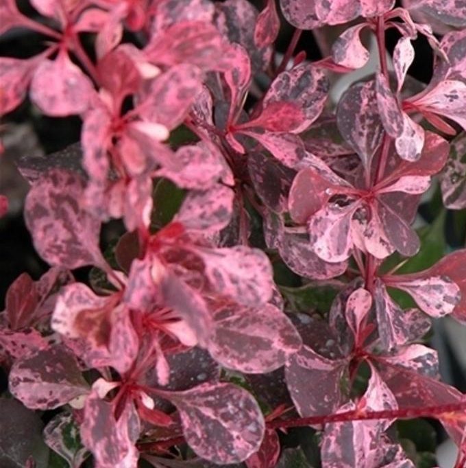 Саженцы кустарника барбариса Пинк Атракшн (Pink Attraction) отличаются своей густой раскидистой кроной с крупными по размерам приростами. Листья растения достигают в дину 1 – 3 см. Сначала они насыщенно красные с розовыми штрихами, а впоследствии становятся красно-фиолетовыми. Пестрота характерна только для текущего прироста. Зацветает кустарник в мае-июне, цветет он обильно по времени где-то 20 дней. Цветы одиночные или в соцветиях по 2 – 5 штук красные сверху и желтые изнутри. Если саженцы разместить в подходящем месте, то они практически не подвергаются болезням. В морозные зимы побеги могут промерзнуть той частью, которая будет располагаться выше уровня снега. Но она быстро восстанавливается и весной отрастает снова.