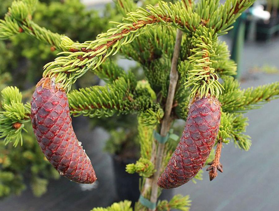 Саженцы Ели колючей Лаки Страйк (Lucky Strike) – маленькое медленнорастущее дерево, у которого крона неправильной формы конуса. Длина около 2х метров. Ель имеет щетинистую, глянцевую, хвою темно-зеленого окраса, длина которой 2-3- сантиметра. У растения изогнутые ветви и большие лилово-красные шишки, которые позже становятся коричневыми.