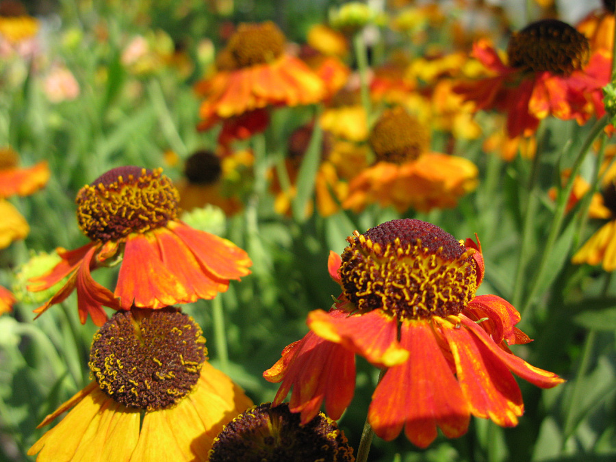 Рассада Гелениума гибридного Mardi Gras (Марди Грасс) хорошо чувствует себя в достаточно плотных посадках вместе с осенними астрами.