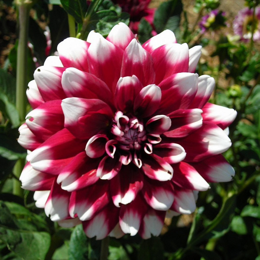 Клубни георгины махровой Контраст (Dáhlia variabilis Contraste) позволят вырастить пышные кусты высотой от 60 до 100 сантиметров. Они покрыты шапками ярких махровых цветов диаметром 12-20 сантиметров. Лепестки пурпурной окраски испещрены крупными белыми пятнами. Они не плоские, а рифленые, и слегка отогнуты к стеблю. Поэтому цветок получается пышным и объемным. Кусты будут радовать цветением с июня по сентябрь. Высаживать клубни нужно на солнечном участке, одиночно или группами, на расстоянии до 100 сантиметров. На зиму их нужно выкапывать, потому что они не переносят мороза.
