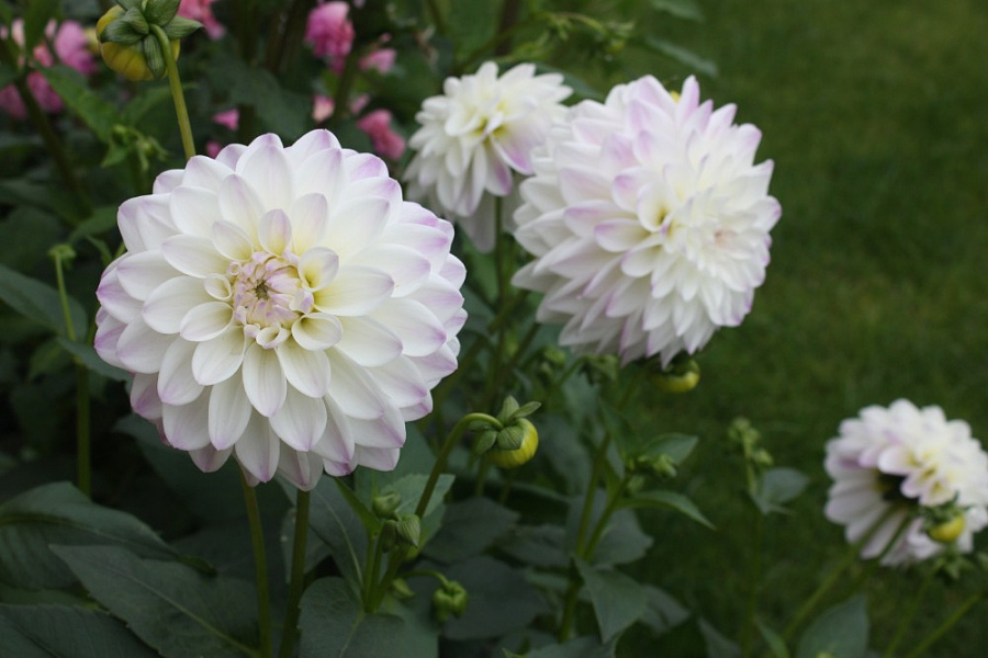 Георгина декоративная виттем - это изысканное растение с белыми цветками, украшенными розовым оттенком. Ее стебель прочный и прямой, достигает высоты до 55 см, что делает ее идеальным выбором для создания красивых цветочных композиций в саду или на клумбе. Листья георгины имеют интересную форму и яркий зеленый цвет, что придает растению особый шарм.