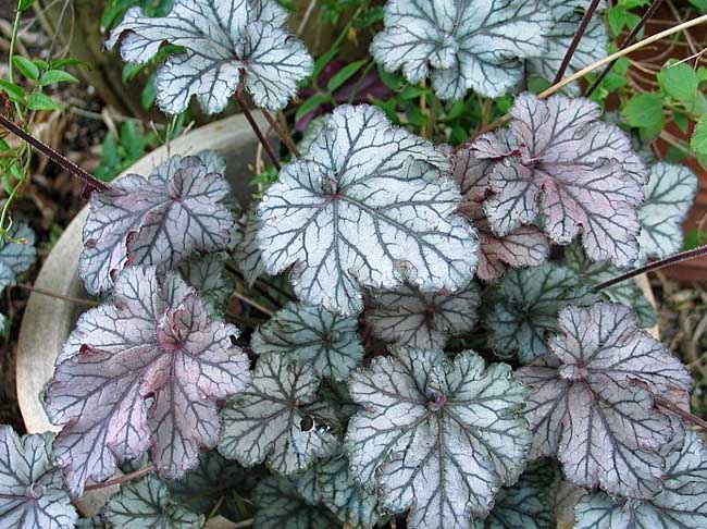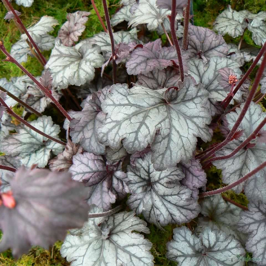 Рассада гейхеры Джипси Дансер (Gypsy Dancer) отлично впишется в смешанную посадку с применением других декоративных растений. Листва многолетника имеет буро-серебристую окраску, на фоне которой контрастно выделяются темно-пурпурные прожилки. Этот сорт цветет на протяжении всего лета, выпуская стебли с мелкими белыми соцветиями.