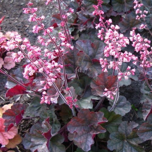 Рассада гейхеры Кассис (Cassis) удачно сочетает эффектный вид и неприхотливость в уходе. Листья многолетника имеют бронзово-пурпурную окраску, а на цветоносах образуются нежные розовые цветочки. Этот сорт широко применяется в ландшафтном дизайне. Он гармонично смотрится с розами, баданом, геранями и примулами.