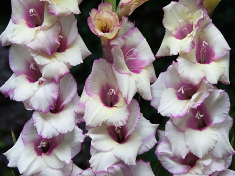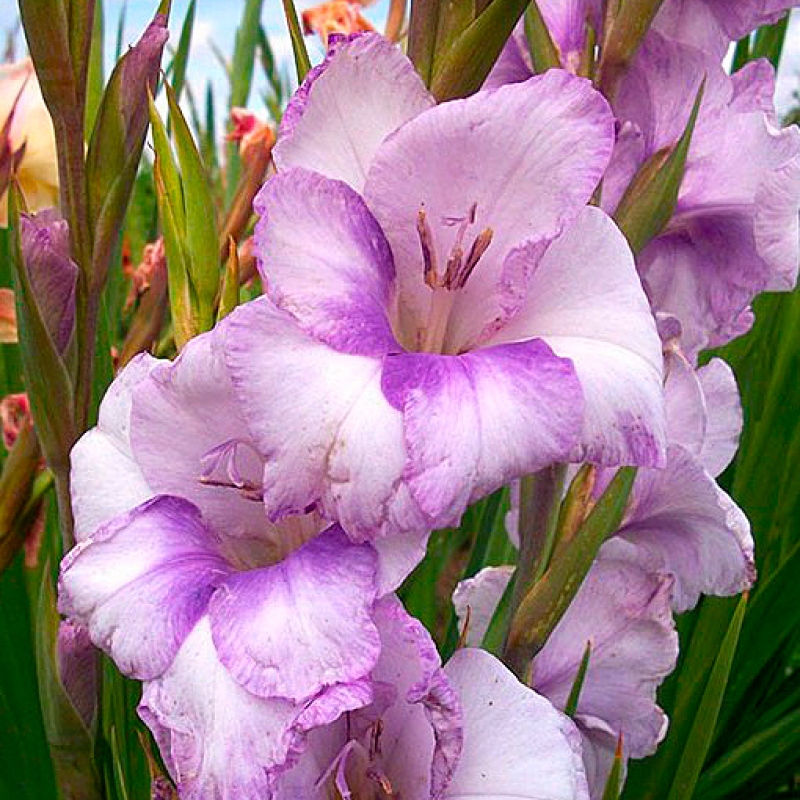Луковицы гладиолуса гибридного Кондор Паса (Condor Pasa) порадуют цветоводов нежными, привлекательными бутонами уже через 3 месяца после посадки. Изящное, высокое растение, по форме напоминающее устремленный ввысь меч, украсит любой садовый участок или околодомовую территорию. Особенности сорта: цветет сразу несколькими (около 5-8 штук) бутонами, расположенными по бокам стебля, с середины июля до августа. Расцветка благородная молочно-белая с характерными прожилками сиреневого цвета. Растение солнцелюбивое, неприхотливое. Идеально подходит для создания букетов.