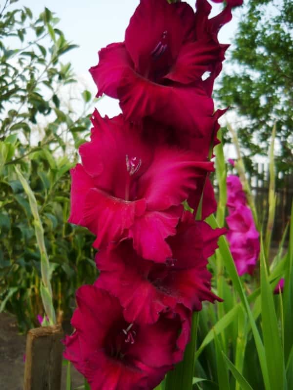 Луковицы гладиолуса гибридного Плум Тарт (Plum Tart) со временем превращаются в красивое растение, цветущее изящными темными цветками, диаметр которых может достигать 14 сантиметров. Лепестки цветов бархатистые, обладают глубоким красным оттенком, у основания идет переход в малиново-красный цвет. Сорт Plum Tart считается одним из самых крупноцветных сортов гладиолусов. Края цветка слегка гофрированы. Гладиолус гибридный Плум Тарт цветет в июле-сентябре, соцветие широкое, высота цветоноса достигает 1,2 метра. Прекрасно смотрится в миксбордерах. Гладиолус рекомендуется высаживать на хорошо освещенных солнцем местах. Срезанные цветы долго сохраняют свежесть. Форма цветков треугольная. В букетах и на цветочных грядках смотрится роскошно – богатое соцветие насчитывает до 15 цветков.