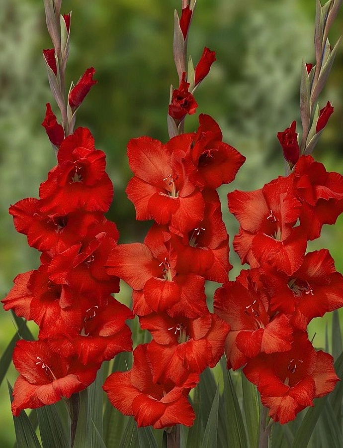 Гладиолус крупноцветковый йоска - это великолепное растение с красивыми крупными цветками, окрашенными в яркие оттенки красного с оранжевым отливом. Высота этого гладиолуса может достигать 80-110 см, что делает его заметным акцентом в саду или на газоне. Листья зеленой окраски создают прекрасный контраст с яркими цветами, придавая растению особый шарм.