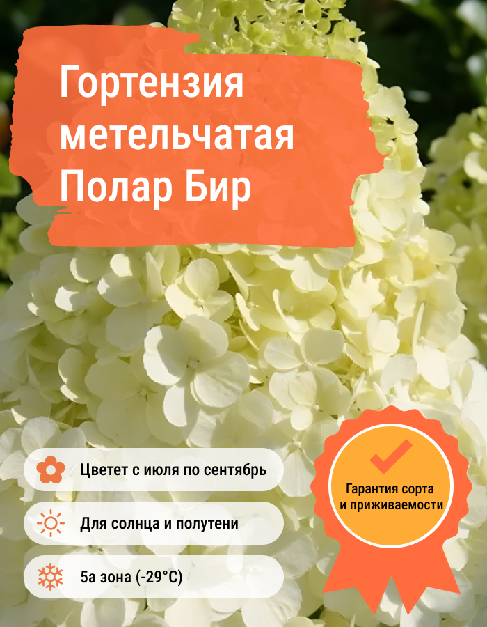 Саженцы гортензии метельчатой Polar Bear (Полар Бир) являются помесью сортов Limelight и Grandiflora. Для крупномера PolarBear характерно: 1. Ветвистый кустарник, диаметр которого может достигать полутора метров, а высота - двух; 2. Форма соцветий коническая, их длина примерно 40 см. Цвет сначала имеет зеленый оттенок, а затем становится бледно-розовым; 3. Листья крупные, осенью становятся желтыми; 4. Период активного цветения июль-октябрь; Саженцы гортензии метельчатой Polar Bear предпочитают влажную почву с кислой либо нейтральной средой. Очень зимостойки и устойчивы к заболеваниям.