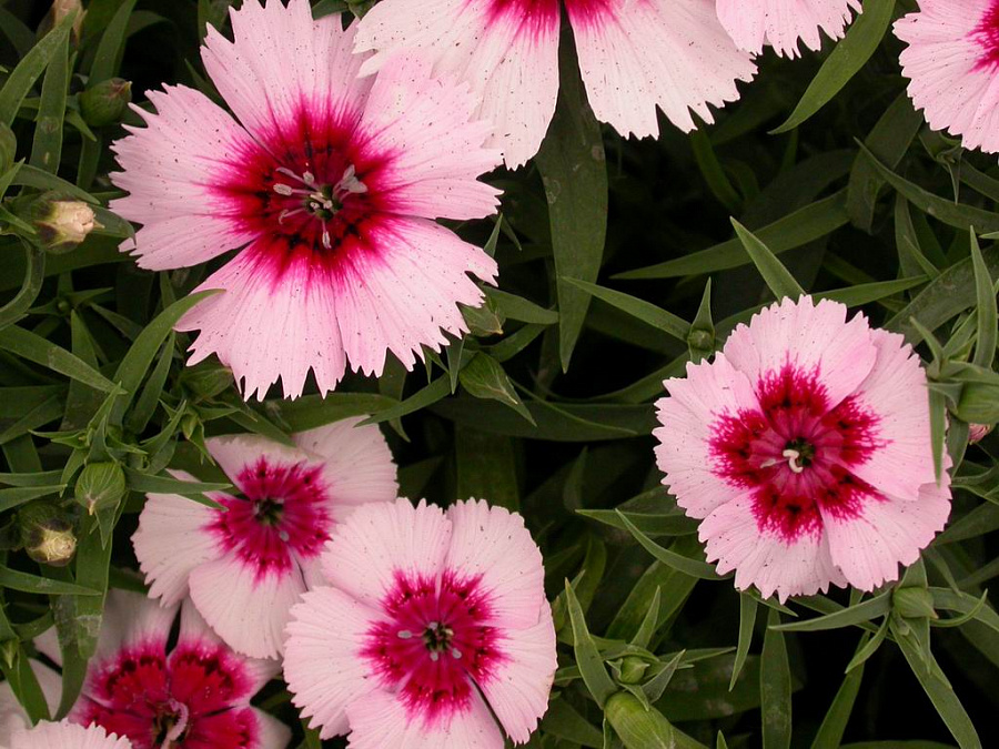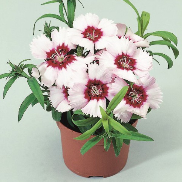 Гвоздика Diana Purple Centred White - это удивительное растение с бело-красными цветками, которые привлекают внимание своей красотой и изысканностью. Высота этого растения может достигать 15-20 см, что делает его идеальным выбором для групповых посадок. Листья гвоздики имеют ярко-зеленый оттенок, создавая контраст с яркими цветами.