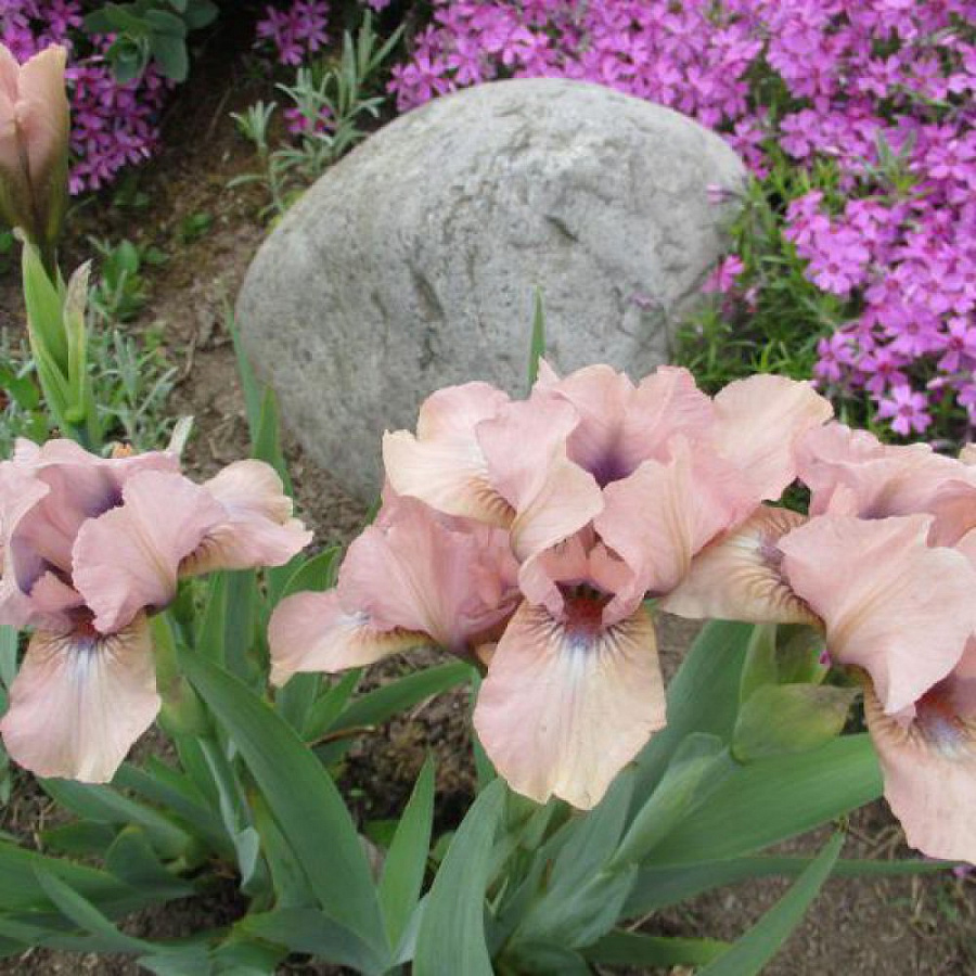 - высокая засухоустойчивость. Выпавшие семена редко дают всходы, поэтому принято размножать растение делением корня. Цветок имеет пастельно-розовый оттенок с коричневыми прожилками и голубовато-фиолетовой бородкой. Ирис карликовый Вольт прекрасно смотрится в групповых посадках на небольших клумбах или по периметрам садовых дорожек.