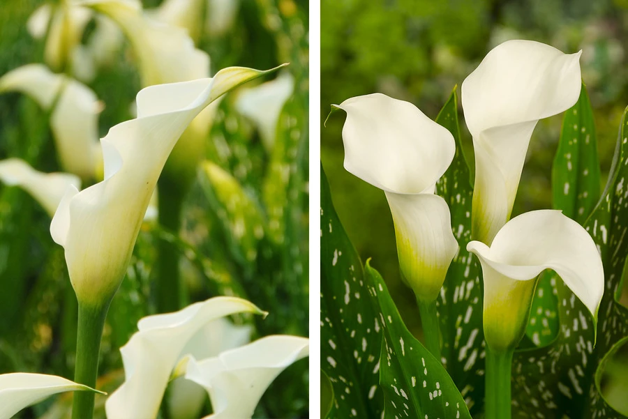 Калла белопятнистая - это изысканное растение с темно-зелеными листьями и белыми цветками, которые расцветают в марте. Ее высота достигает 50-60 см, что делает ее идеальным выбором для миксбордеров. Это растение предпочитает солнечные места и дренированные богатые почвы.
