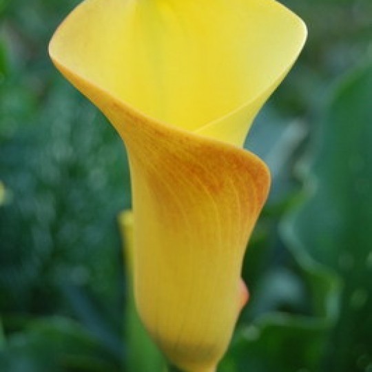 Луковицы Калла Peach Chiffon способны наполнить сад яркими красками — ведь даже соцветие у этого сорта ярко-желтое. Лист большой и широкий, покрыт белыми мелкими пятнышками. Над зеленой листвой возвышаются цветоносы с крупными цветами. Они ярко-желтого цвета с красной размытой каймой по краю. Размер цветка достигает 6–8 сантиметров в диаметре. Цветение каждого цветоноса длится от 2 до 4 недель. Растение любит солнечное место, но без попадания прямых солнечных лучей. Прекрасно растет в легком затенение. Каллу Peach Chiffon используют в срезке, озеленение и выращивают как горшечную культуру.