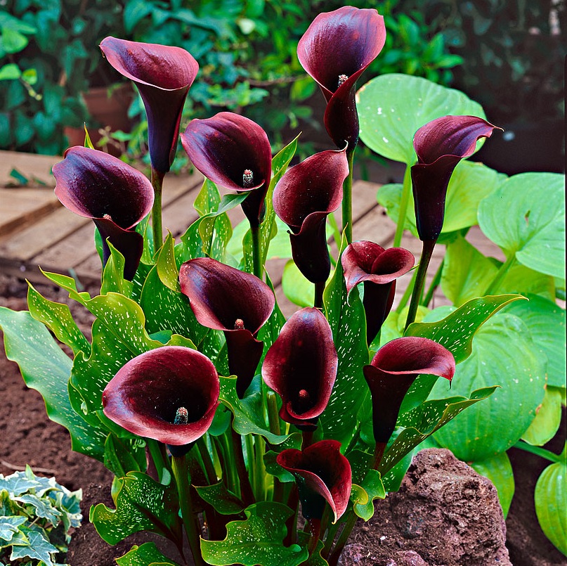 Необычный оттенок цветка калла Шварцвельдер (Calla Schwarzwalder) станет акцентом вашего сада – глубокая темная, почти черная воронка к краям становится темно-бордовой. Цветок до 8 сантиметров длиной, диаметр достигает 10 сантиметров. Необычное растение обладает уникальной декоративностью. Великолепно смотрится в одиночных посадках, сочетается со светлыми вечнозелеными растениями – кустарниками и хостой. Прекрасно чувствует себя в горшках. Необычный оттенок цветка привлекает к себе внимание, растение предпочитает солнечные или слегка затемненные места. Хорошо растет в слабокислых почвах. Очень декоративно, богато выглядит в букетах.