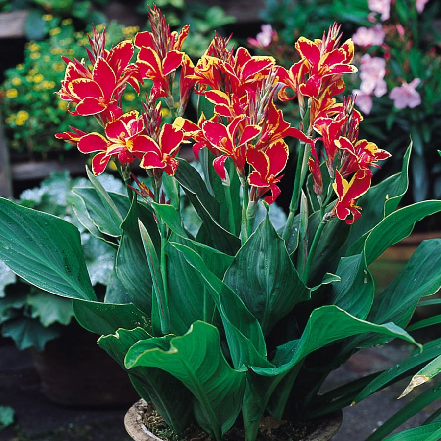 Канна карликовая Lucifer - это удивительное растение, которое поразит вас своей красотой и изяществом. Ее стебель тонкий и прочный, достигает высоты до 50 см, а цветки, окрашенные в ярко-красный цвет с желтой каймой, создают неповторимый вид. Листья зеленого цвета добавляют свежести и яркости вашему саду.