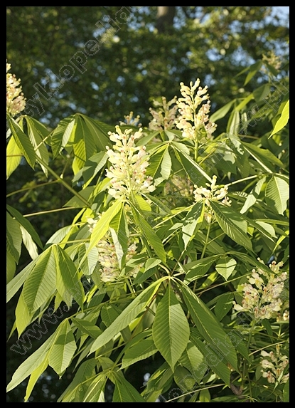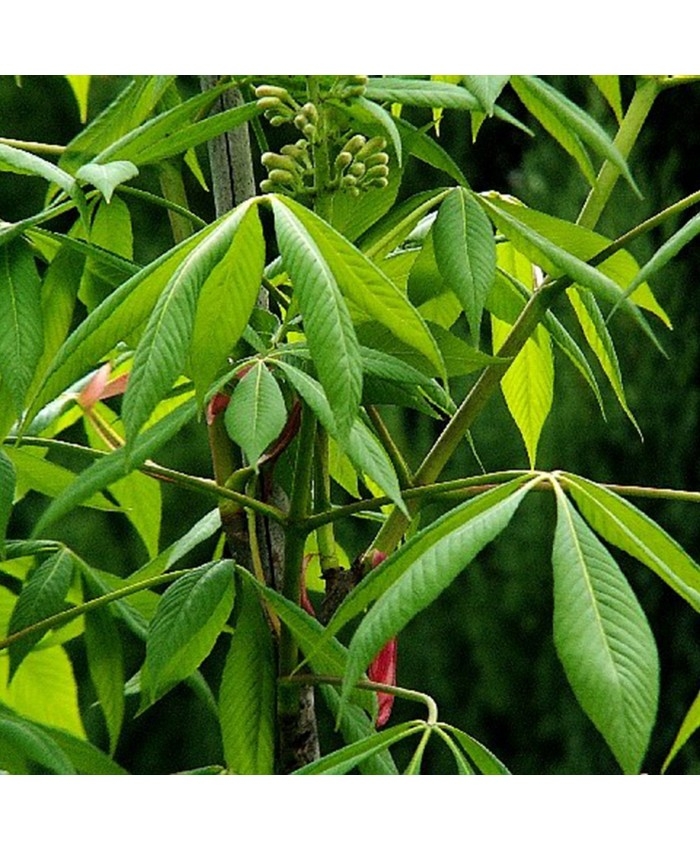 Саженцы Каштана конского сизоватый (Aesculus glaucescens) представляют собой невысокое дерево, высота которого варьируется от 10 до 15 метров. Крона не плотная, округлой формы. Листья имеют форму удлиненной продольной лодочки и расположены на коротких черенках, собранных в композиции по пять штук. Соцветия представлены небольшими пирамидками, рыхловатые.