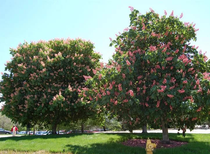 Саженцы конского каштана Вриоти (Briotii) вырастут в красивое крупное дерево с широкой зеленой кроной высотой до 15 метров. Особенно эффектен он в период цветения, когда на зеленом фоне распускаются красные цветы в конусообразных соцветиях в мае при достижении десятилетнего возраста. Этот вид и называют каштаном красноцветным. Запах при цветении особенно приятный. В осенний период появляются немногочисленные колючие округлые плоды. Условия посадки и развития таковы: