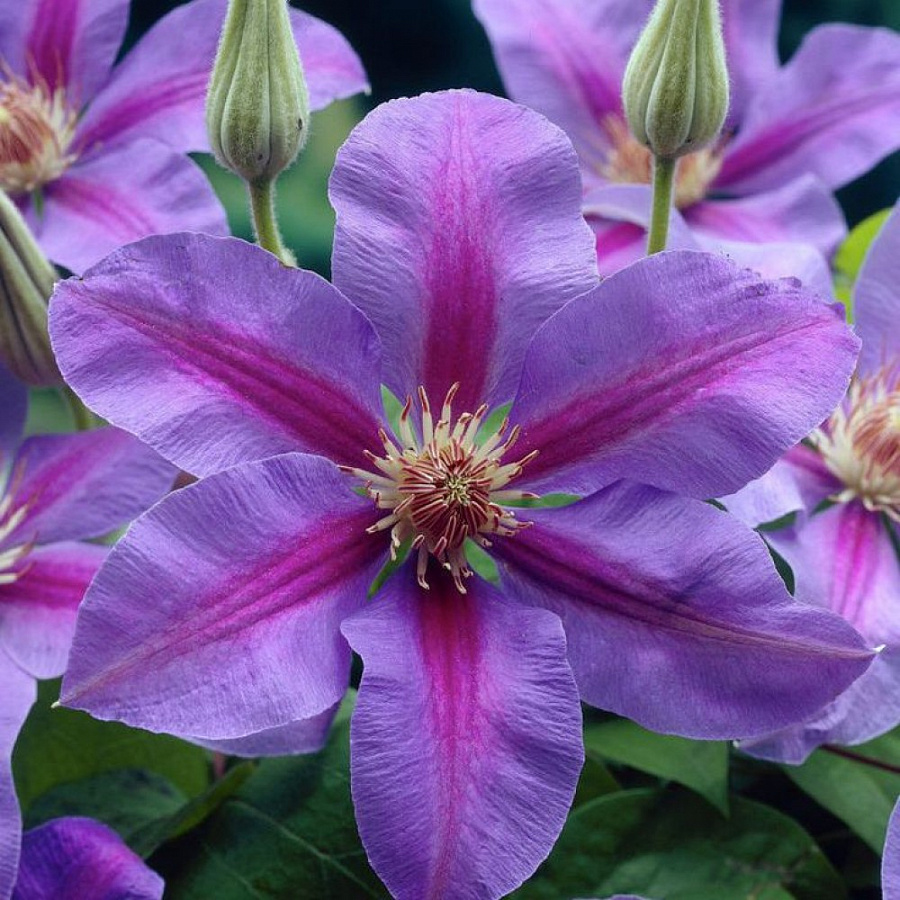 Клематис крупноцветковый Максимилиан Кольбе - это великолепное растение, которое поразит вас своей красотой и изяществом. Его стебель достигает высоты до 200-300 см, создавая великолепный вертикальный акцент в вашем саду. Листья этого клематиса имеют уникальную форму, а цветки лилово-розового оттенка с розовой полоской посередине радуют глаз в течение нескольких месяцев в году.