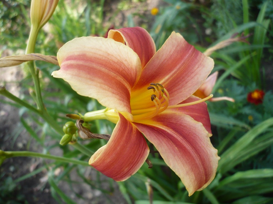 Цветы практически без аромата, среднего размера и имеют красный оттенок лепестков с широким кремовым краем и такого же цвета средней линией. Горлышко у цветка желто-зеленое. Массовое цветение можно наблюдать  в начале августа.