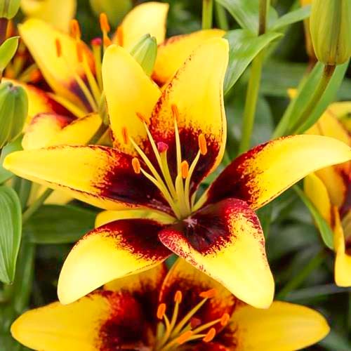 Луковицы Лилии азиатской Танго Бамблби (Lilium asiatic hybrid Tango Bumblebee) ― сорт невероятной красоты, привлекающий внимание контрастной окраской лепестков. На кусте высотой до 1 метра распускаются крупные цветки лимонно-желтого цвета с темным центром и окантовкой лепестков. Словно тропические бабочки, они наполняют сад, «порхая» над цветами с более скромной окраской.