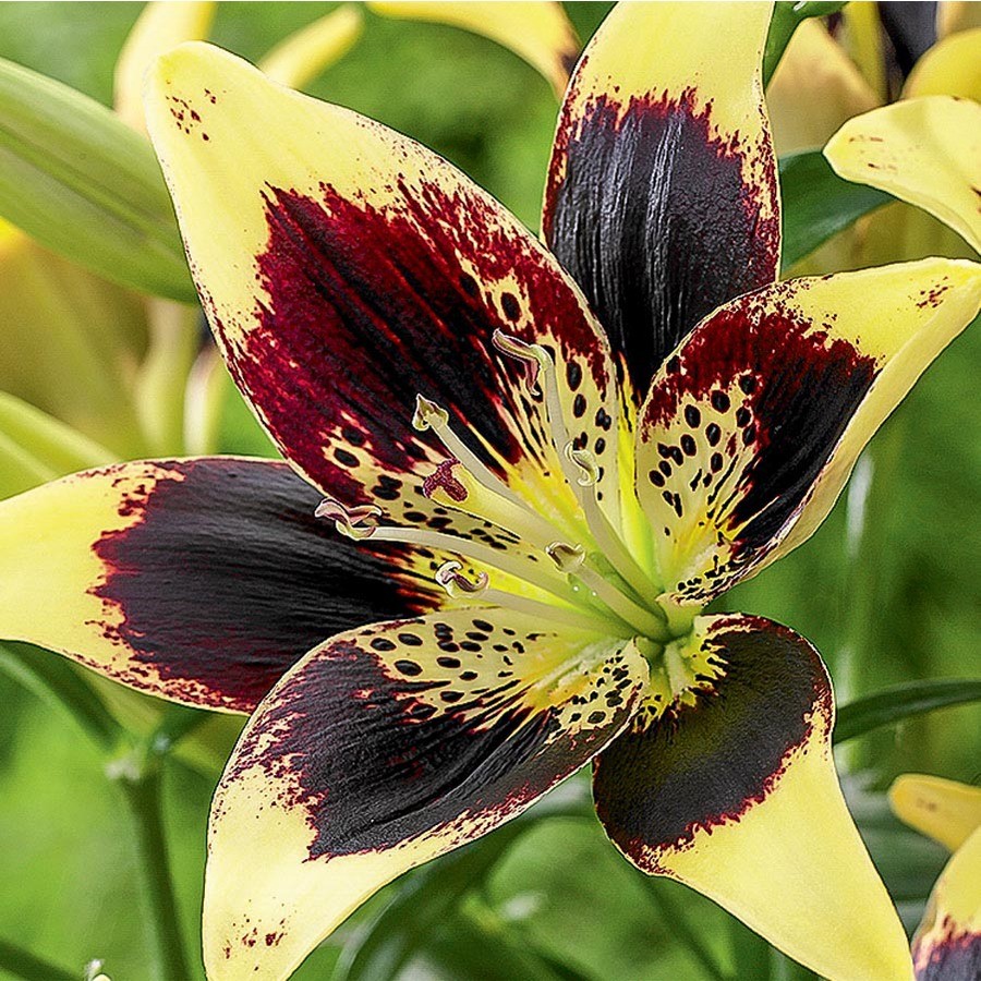 Луковицы Лилии азиатской Танго Изи Данс (Lilium asiatic Easy Dance) ― еще один популярный представитель известной группы «танго», отличающийся интересной расцветкой. Характерное для сорта темное плотное пятно у Изи Данс насыщенно-фиолетового цвета, в центре можно видеть незначительный темный крап на желтом фоне. Основной цвет, покрывающий лепестки в их верхней части, светло-желтый.