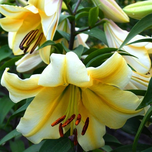 Лилия от-гибрид сантини - это великолепное растение, которое поразит вас своей красотой и изысканностью. Ее стебель прочный и прямой, достигает высоты до 120 см, а цветки кремового цвета с желтыми мазками и темными пыльниками радуют глаз весной и летом. Листья лилии имеют зеленую окраску и уникальную форму, что делает растение еще более привлекательным.
