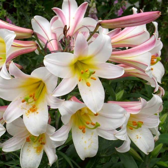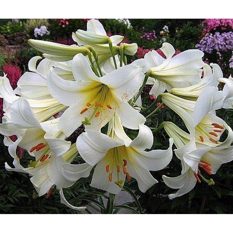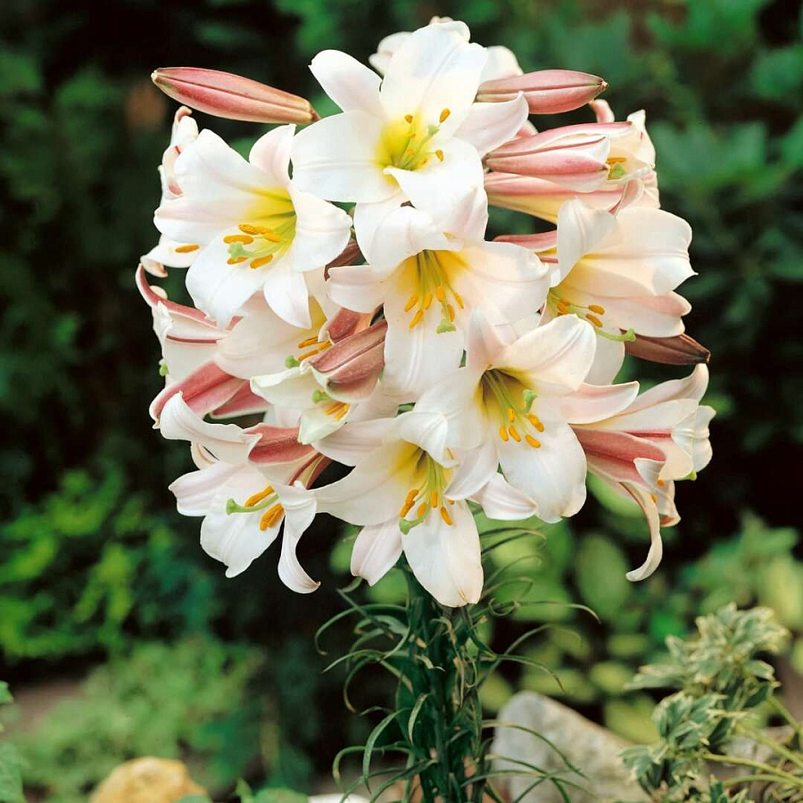 Лилия трубчатая Regale Album - это великолепное растение, которое поразит вас своей изысканной красотой. Ее стебель достигает высоты до 120 см, а цветки диаметром до 24 см украсят ваш сад своим белоснежным оттенком с желтоватым центром. Листья лилии имеют зеленую окраску и создают прекрасный контраст с яркими цветами.