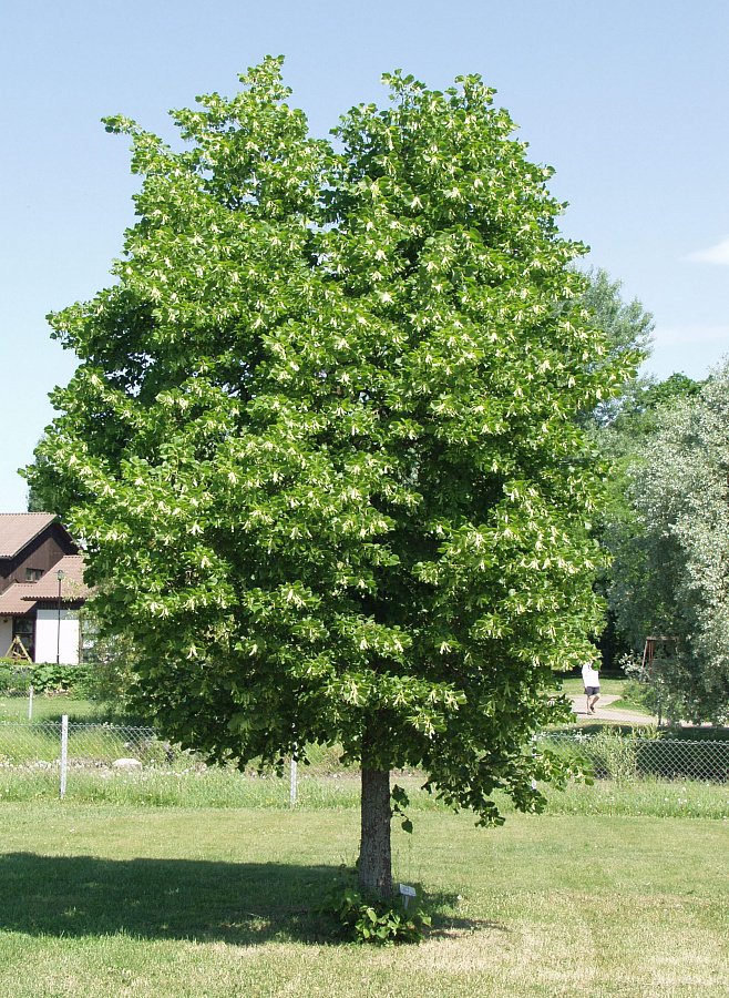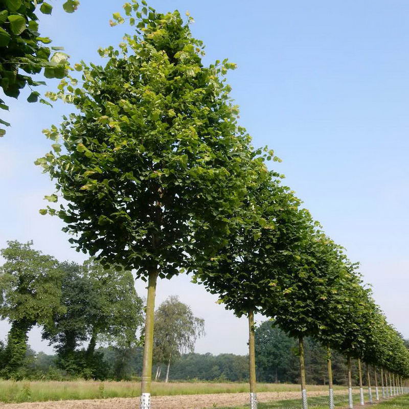 Саженцы липы крупнолистной - проверенный годами вид листопадных деревьев, отличается шикарной густой кроной, ароматным цветением и стойкостью к погодным условиям. Взрослые крупномеры очень высокие – до 30-40 м. Главная прелесть растения – в обилии душистых цветов, источнике целебных свойств. Цветение начинается в первой половине лета, желтыми соцветиями, из которых развиваются плоды – ребристые орешки. Листья заостренные, сердцевидные. Крона у липы крупноцветной по форме похожа на округлую пирамиду. Достоинства: