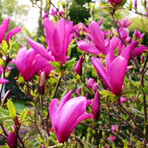 Саженцы магнолии гибридной Сюзан (Susan) вырастают в густые декоративные кустарники, всегда обильно цветут, издавая тонкий аромат. Вырастают крупномеры до 2-3 м. Цветение начинается в апреле, до появления листвы, и длится 1,5-2 месяца. Листья темно-зеленые, овальной формы. Цветы темно-пурпурные, в форме узких чаш. Магнолия гибридная Сюзан довольно быстро растет – до 20 см в год.