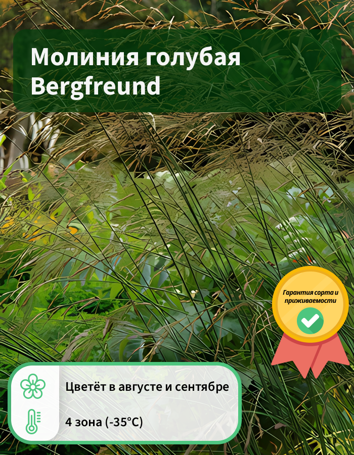 Рассада молинии голубой Bergfreund (Molinia caerulea) хорошо себя чувствует в очень влажной болотистой почве. Поэтому чаще всего многолетник используют для оформления зон у водоемов. Взрослые растения образуют невысокие кустики из листьев, зеленых летом и золотистых осенью (у некоторых сортов – пестрых). Цветение наступает в июле-августе. Цветоносы с узкими соцветиями-метелками на вершине возвышаются над листьями на высоту до 100 см. Мелкие цветочки молинии голубой Bergfreund окрашены в темно-фиолетовый цвет.