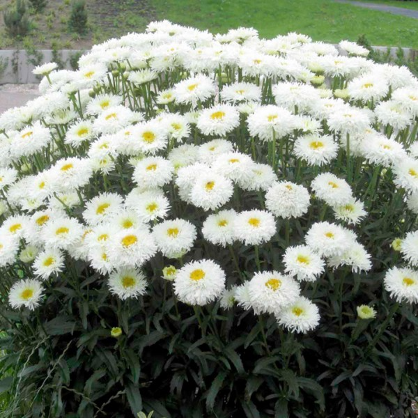 Рассада нивяника Снегурка (Snehurka) имеет прямостоячие стебли и лапчатую зеленую листву. В июне-августе зацветает белым, махровым цветением. Цветочки имеют узкие и рассеченные лепестки. В диаметре цветы составляют около 7 см и идеально подходят для срезки. Преимущества нивяника Снегурка: