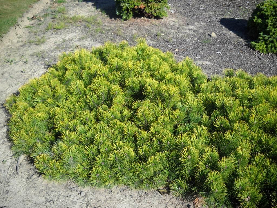 Саженцы Сосны горной Хостин Голд (Hostyn Gold, Pinus mugo) – карликового хвойный кустарник с подушковидной кроной и желтой хвоей в зимний период, летом хвоя зеленого цвета. К 10-ти годам высота 30-40 см и ширина 60-70 см. Годовой прирост 3-5 см. Крона асимметричная. С возрастом начинает разрастаться в стороны. Хвоя блестящая, длиной до 3-5 см., ярко-зеленая с весны до середины осени, затем желтеет. Зимостойка и светолюбива. Хорошо смотрится в сочетании с темно-зеленой листовой, на фоне других хвойных растений в зимний период.