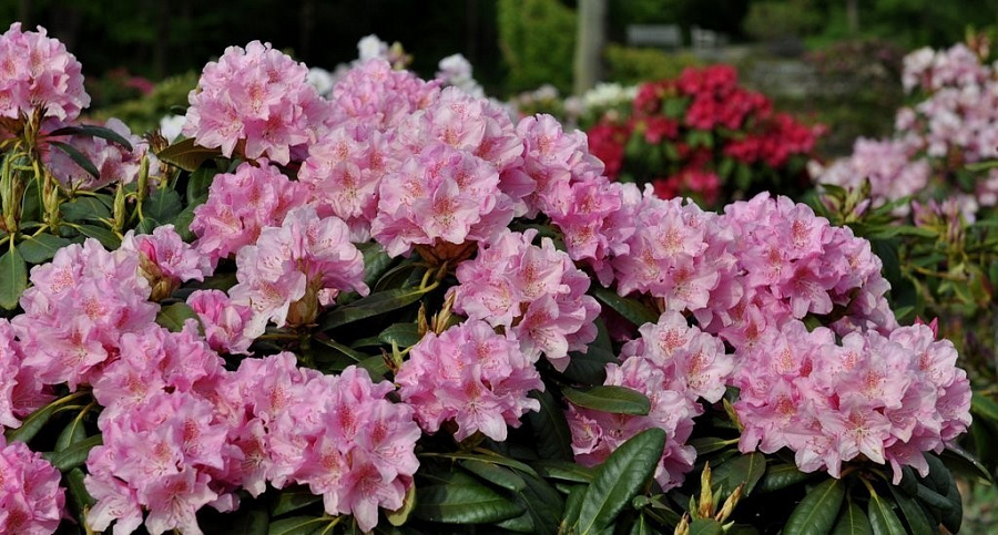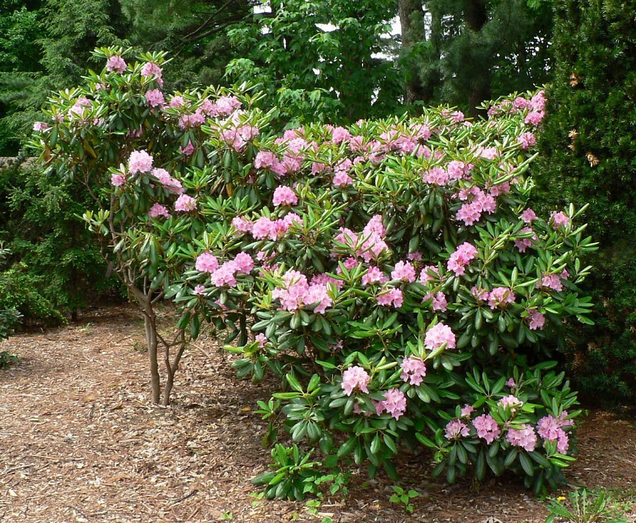 Рододендрон Helsinki University - Сорт был выведен в Финляндии в 1974 году и назван в честь 350-летия университета Хельсинки. Считается самым зимостойким из всех рододендронов в условиях северо-запада России. Он способен выдерживать холод, повышенную влажность, экстремально низкие температуры, а также ее перепады. Цветение начинается в начале июня, и обильно цветут даже молодые растения. Цветки воронкообразные (до 7,5см), нежно-розовые с тёмно-красными крапинами на верхнем лепестке, со слегка волнистыми краями, в соцветиях по 12-18 шт. Прекрасно растет и цветет не только в полутени высоких деревьев, но и достаточно плотной тени зданий. Морозостойкость цветочных почек очень высокая, поэтому данный сорт цветёт обильно даже после суровых зим. Диаметр кроны взрослого растения - 1.5 м, высота куста - 1.7 м. Листья эллиптические, тёмно-зелёные, блестящие, длиной до 15 см. Вечнозеленые сорта рододендрона получены селекционным путем и поэтому их еще называют гибридными. Гибридный рододендрон очень популярен и славится своими декоративными качествами и морозостойкостью. Отличается длинными кожистыми листьями, большими цветами, почти всех возможных оттенков, в зависимости от сорта. Цветёт в мае и июне.