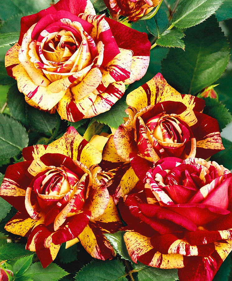 Саженцы розы Абракадабра (Abracadabra) – это настоящее чудо у вас на участке. Их высаживают весной, желательно в предварительно удобренную, богатую, рыхлую почву. Зацветает кустарник обильно, цветки не опадают полностью на протяжении всего сезона. Основное отличие крупномеров Абракадабра – необычная расцветка, в которой сочетаются: