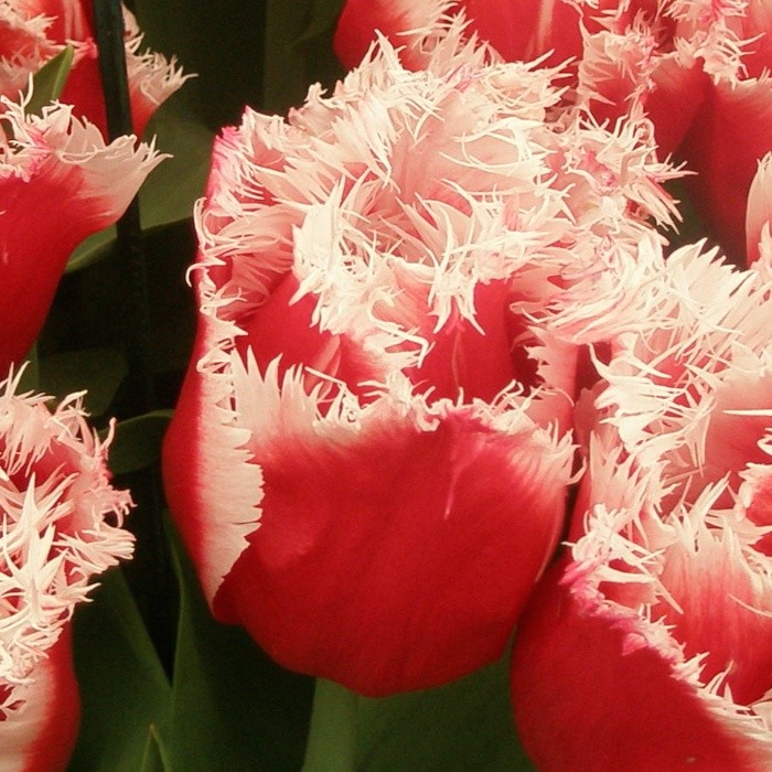 Луковицы тюльпана бахромчатого New santa принадлежат к сортам поздних сроков цветения. Первые бутоны распускаются лишь в середине — конце мая. Зато цветы очень эффектные. Красные бокалы длиной 7-8 сантиметров украшены на каждом лепестке белоснежной бахромой. Цветоножка крепкая и устойчивая. Высота растения 50 сантиметров. Тюльпан бахромчатый New santa великолепно смотрится в больших самостоятельных группах и в сочетании с сортами более светлых тонов.