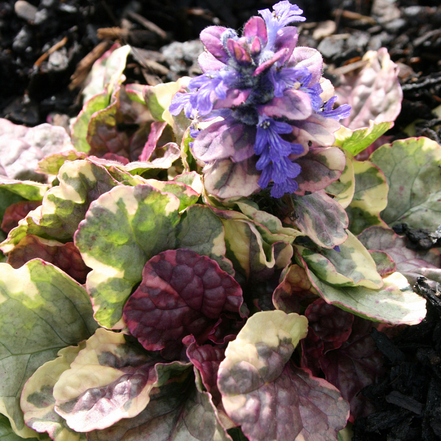 Рассада живучки Пати Колерз (Party Colours) быстро разрастается, благодаря своим ползучи побегам, которые укореняются. Привлекает внимание садоводов не своим цветением, а оригинальной листвой. Листики большие округлой формы имеют лилово-бело-зеленый окрас. Преимущества живучки Пати Колерз: